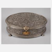 um 1890, ungemarkt, Metallguss fein ziseliert und poliert, Ovalform auf genieteten Tatzenfüßen, vergoldete Applikationen am Schlüsselloch und Deckelgriff, innen mit seidenbezogener Pappe ausgekleidet, der Deckel dekoriert mit Engelsmotiven, Rollwerk und Delfinen, dazu original Schlüssel, guter altersgemäßer Zustand, L 31 cm.