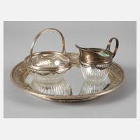 um 1900, gestempelt 800, Halbmond, Krone, undeutliche Herstellermarke, verziert mit Festons- und Kreuzbanddekor, die Gefäße aus farblosem Glas mit geschliffenem Bodenstern und Schälschliffornamentik, das passende runde Tablett mit facettiertem Spiegelglaseinsatz, D 23,5 cm, G total ca 765 g.