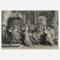 Salome mit dem Haupt Johannes des Täufers vor Herodes und Herodias, umgeben von einer Tischgesellschaft, nach Peter Paul Rubens, unter der Darstellung Text in Latein, Kupferstich, 1. Hälfte 17. Jh., unter der Darstellung in der Platte links bezeichnet „Petr. Paul Rubens pinxit A. a. Bolswert sculpsit.“ und rechts „Gillis Hendriex exudit.“, unter Passepartout und hinter Glas gerahmt, restauriert, Darstellungsmaße ohne Schrift ca. 40,5 x 59,7 cm. Künstlerinfo: geboren als Schelte Adamszoon van (oder "De" bzw. "à") Bolswart bzw. Bolswert, verwandte die Pseudonyme "Schetleon", "Schelderic" und "Childerik", niederländischer Kupferstecher (ca. 1581 oder 1586 Bolsward bis 1659 Antwerpen), Schüler seines Bruders Boetius Adamsz Bolswert (ca. 1580 oder 1585 bis vor 1633), zeitweise in Haarlem, spätestens ab 1611 in Amsterdam nachweisbar, 1617 Mitarbeiter der Officina Plantiniana in Antwerpen, um 1627 zeitweise in Brüssel tätig, ab 1625 Mitglied der Lukasgilde Antwerpen und 1628 hier ansässig, um 1628 Bekanntschaft mit Peter Paul Rubens, mit dem ihm ab 1633 eine enge Zusammenarbeit verband, arbeitete ferner als Reproduktionsstecher nach Jacob Jordaens, Anton van Dyck, David Vinckeboons, Erasmus Quellinus, Abraham van Diepenbeeck, Gerard Seghers und Theodor Rombouts, Quelle: AKL, Thieme-Becker und Wikipedia.