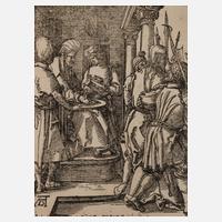 Blatt 9, „Die Fußwaschung“, Holzschnitt, geschnitten um 1509-11, wohl späterer Abzug, rechts unten ligiertes Monogramm „AD“, Bartsch 25, an einer Seite in die Einfassungslinie beschnitten, leicht braunfleckig, kleiner Einschnitt, unter Passepartout montiert, Blattmaße ca. 12,5 x 9,6 cm. Künstlerinfo: bedeutender dt. Maler, Kupferstecher, Holzschnittzeichner und Kunstschriftsteller (1471 Nürnberg bis 1528 Nürnberg), Schüler seines Vaters als Goldschmied, 1486-90 Lehre und Mitarbeiter beim Maler Michael Wohlgemut, 1490-94 Wanderschaft an den Oberrhein, 1494 erste Italienreise, ab 1501 mit Hans Schäuflein, Hans Baldung Grien und Hans von Kulmbach eigene Werkstatt in Nürnberg, 1505 Reise nach Venedig, 1518 Vertreter der Stadt Nürnberg auf dem Reichstag in Augsburg, 1520-21 Reise über Mainz, Frankfurt am Main und Köln nach Antwerpen, leitete anschließend die Ausstattung des Nürnberger Rathauses, Quelle: Thieme-Becker, Wikipedia und Internet.
