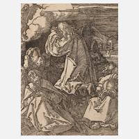 Blatt 10, „Christus am Ölberg“, Holzschnitt, geschnitten um 1510, wohl späterer Abzug, links unten ligiertes Monogramm „AD“, Bartsch 26, schmaler Papierrand, im oberen Bereich retuschierter Verlust, unter Passepartout montiert, Darstellungsmaß ca. 12,6 x 9,8, Blattmaße ca. 13,0 x 10,0 cm. Künstlerinfo: bedeutender dt. Maler, Kupferstecher, Holzschnittzeichner und Kunstschriftsteller (1471 Nürnberg bis 1528 Nürnberg), Schüler seines Vaters als Goldschmied, 1486-90 Lehre und Mitarbeiter beim Maler Michael Wohlgemut, 1490-94 Wanderschaft an den Oberrhein, 1494 erste Italienreise, ab 1501 mit Hans Schäuflein, Hans Baldung Grien und Hans von Kulmbach eigene Werkstatt in Nürnberg, 1505 Reise nach Venedig, 1518 Vertreter der Stadt Nürnberg auf dem Reichstag in Augsburg, 1520-21 Reise über Mainz, Frankfurt am Main und Köln nach Antwerpen, leitete anschließend die Ausstattung des Nürnberger Rathauses, Quelle: Thieme-Becker, Wikipedia und Internet.