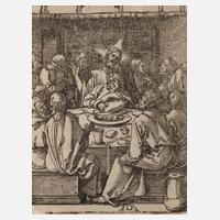 Blatt 8, „Das letzte Abendmahl“, Holzschnitt, geschnitten um 1508-09, wohl späterer Abzug, unten fast mittig ligiertes Monogramm „AD“, Bartsch 24, schmaler Papierrand, Retuschen, Fehlstelle im Bereich von Jesu, in den beiden unteren Ecken Verluste, geschlossener Einriss, unter Passepartout montiert, Darstellungsmaß ca. 12,8 x 10 cm, Blattmaße ca. 13,2 x 10,2 cm. Künstlerinfo: bedeutender dt. Maler, Kupferstecher, Holzschnittzeichner und Kunstschriftsteller (1471 Nürnberg bis 1528 Nürnberg), Schüler seines Vaters als Goldschmied, 1486-90 Lehre und Mitarbeiter beim Maler Michael Wohlgemut, 1490-94 Wanderschaft an den Oberrhein, 1494 erste Italienreise, ab 1501 mit Hans Schäuflein, Hans Baldung Grien und Hans von Kulmbach eigene Werkstatt in Nürnberg, 1505 Reise nach Venedig, 1518 Vertreter der Stadt Nürnberg auf dem Reichstag in Augsburg, 1520-21 Reise über Mainz, Frankfurt am Main und Köln nach Antwerpen, leitete anschließend die Ausstattung des Nürnberger Rathauses, Quelle: Thieme-Becker, Wikipedia und Internet.
