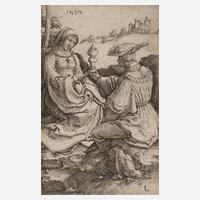 Edelmann, einer Dame einen Pokal reichend, im Hintergrund Schlossanlage, siehe New Holstein 148, Kupferstich mit gleichmäßigem Plattenton, in der Darstellung datiert „1520“ und monogrammiert „L“, auf Passepartoutrückseite Titel in Blei „Edelmann und Dame in einer Landschaft sitzend“, bis an die Darstellung beschnitten, unter Passepartout montiert, Blattmaße 11,6 x 7,4 cm. Künstlerinfo: auch Lucas Hugenszoon von Leyden, Lucas de Holandere oder Luca d'Olanda, bedeut. niederl. Maler, Zeichner und Kupferstecher (1494 Leiden bis 1533 Leiden), zunächst Schüler seines Vaters Hughe Jacobsz, nach dessen Tod Schüler des Malers Cornelis Engelbrechtsen, 1521 Treffen mit Albrecht Dürer in Antwerpen, ab 1522 Mitglied der Antwerpener Malergilde, 1527 mit Jan Mabuse Reise nach Belgien, anschließend Erkrankung und durch Bettlägrigkeit nur noch eingeschränkt arbeitend, Quelle: Thieme-Becker und Wikipedia.