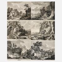 sechs Stück Landschaftsdarstellungen mit Figurenstaffage, unter der Darstellung Text, teils nach fremden Vorlagen von Johann Georg Wille und Didricy, Radierungen, Mitte 18 Jh., unter der Darstellung rechts bezeichnet „Gravé par F. Weirotter“, zwei Blatt mit Faltlinie, teils geringe Altersspuren, je unter Passepartout und hinter Glas gerahmt, Darstellungsmaße ca. 25 x 34 cm. Künstlerinfo: österreichischer Landschaftsmaler und Radierer (1733 Innsbruck bis 1771 Wien), bereits mit sieben Jahren Vollwaise, 1751–55 Studium an der Wiener Kunstakademie, 1759–63 Parisaufenthalt und Bekanntschaft mit Johann Georg Wille, hierdurch intensive Beschäftigung mit dem Zeichnen nach der Natur, 1763–64 Romaufenthalt, Quelle: Thieme-Becker und Wikipedia.