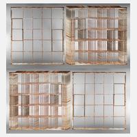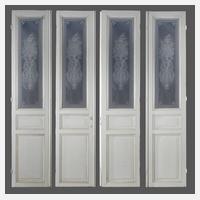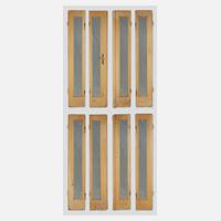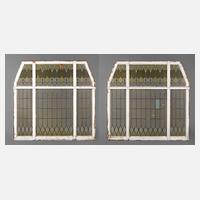 Anfang 20. Jh., Nadelholz massiv, mehrfach gestrichen, bestehend aus je vier schlanken Elementen, Verglasung aus den 1960er Jahren mit Rautenmotiv, Oberfläche rest.bed., Maße je 212 x 160 cm.