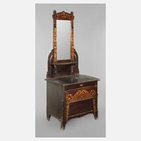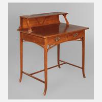 Deutsch, um 1900, nussbaumfurniert, floral verziertes Gestell mit zwei Schubkästen und kleinem Aufsatz, die profilierten Beine leicht zur Seite ausgestellt, originale Messingbeschläge, Oberfläche mit Gebrauchsspuren, Maße 97x 90 x 61 cm.