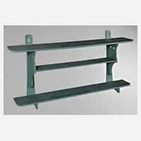 für eine Gewürzgarnitur, deutsch, um 1900, Buche dunkelgrün lackiert, ehemalige cremefarbene Fassung übergangen, die rückseitigen Streben erneuert, Maße 48 x 96 x 16 cm.