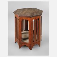 wohl England, um 1900, eichefurniert und massiv, achteckige Platte mit feinen Bandintarsien, diese zum Teil fehlend, Platte mit Trocknungsriss, rest.bed., Maße 67 x 58 x 58 cm.