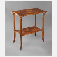 Nancy, um 1900, Gestell aus massiver Buche, in der unteren Platte signiert, fein intarsierter Floraldekor, mit einem großen Schmetterling und Orchideenblüten, restauriert, Maße 75 x 70 x 42 cm.