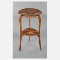 Nancy/Frankreich, um 1900, in der Platte signiert, kleines dreibeiniges Tischchen aus massivem Nussbaum, alle drei Platten mit feiner Blumenmarketerie, Seerosenmotiv, das Gestell wurde in der Höhe gekürzt, Maße 77 x 43 x 43 cm.