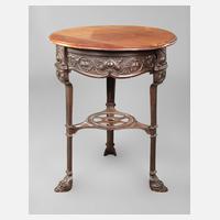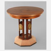 deutsch, um 1910, Mahagoni furniert und massiv, runde Platte mit geometrischen Einlegearbeiten, getragen von achteckigem Fuß, dieser mit vier ovalen geschnitzten und vergoldeten Medaillons und Lorbeerkranz, Fuß mit rosafarbenem Filz bespannt, H 76 cm, D 80 cm.