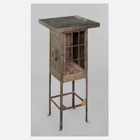 deutsch, um 1905, schmiedeeisernes Gestell, mit Tür (Verglasung fehlt), messingfarbene quadratische Platte mit geometrischen Motiven verziert, Altersspuren, Maße 77 x 32 x 32 cm.