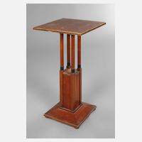 deutsch, um 1910, Mahagoni massiv und furniert, kleines quadratisches Tischchen, die Platte mit umlaufender Rautenbordüre, getragen von vier gedrechselten Vollsäulen, partiell ebonisiert, Oberfläche rest.bed., Maße 77 x 45 x 45 cm.