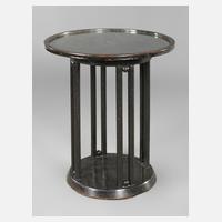 Entwurf 1906, für das Kabarett Fledermaus in Wien, Ausführung Jacob & Josef Kohn um 1910, Bugholz schwarz lackiert und weiß gekalkt, Rand der Tischplatte locker, sonst guter, unrestaurierter Originalzustand, H 75 cm, D 65 cm.