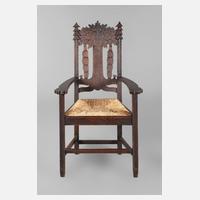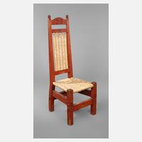 ungemarkt, um 1910, in der Art von Heinrich Vogeler gestalteter Stuhl aus massiver Eiche, dunkelbraun gebeizt, die Lehne verziert mit geschnitztem Eichenlaubdekor, Tannen und Pilzen, trapezförmiger Sitz mit originalem Schilfgeflecht, H 119 x B 68 x T 55 cm.