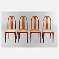 um 1910, Zarge mit Brandstempel und Klebeetikett Thonet Wien, Buchenbugholz rotbraun gebeizt, die Lehne mit geometrischer Intarsie verziert, Sitzgeflecht teilweise erneuert, guter Zustand, mit Gebrauchsspuren, H 103 cm, SH 47 cm.