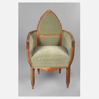 in der Art von Henry van de Velde, um 1905, aus massivem Mahagoni gefertigt, Gestell mit extrabreiten Armauflagen, diese getragen von gedrechselten Rundstäben, Lehne mittels Messingstange in vier Stellungen neigbar, Polster aus braunem Samt, guter unrestaurierter Originalzustand, H 95 x B 75 x T 100 cm. Lit.: Vgl. Wolf D. Pecher, Henry van de Velde. Das Gesamtwerk, S. 214.