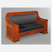 um 1905, nussbaumfurnierter Korpus, die elegant geschwungenen Seitenteile jeweils mit geschwungener Tür, dahinter Barfach, restauriert, Polster und Bezug erneuert, Schlüssel fehlen, Maße 110 x 200 x 75 cm.