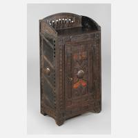 deutsch, 1920er Jahre, schmiedeeisernes Gestell, durchbrochen gearbeitet und mit farbigem Glas hinterlegt, innen zwei Einlegeböden aus Holz, Verglasung nicht ganz komplett, mit Schlüssel, Maße 87 x 45 x 30 cm.
