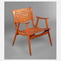 deutsch, 1950er Jahre, Gestell aus massiver Buche, Sitzfläche und Lehne aus Holzplättchen durch Stahlfedern miteinander verbunden, Altersspuren, Verleimungen teilweise gelockert, restaurierungsbedürftig, H 78 x B 58 x T 61 cm.