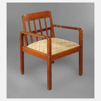 wohl Dresden, 1920er Jahre, aus massivem Kiefernholz gefertigt, schräg eingestellte, leicht gebogene Lehne, leicht konisch zulaufende Armauflagen, eingelegten Sitzkissen mit originalem Stoffbezug (verschmutzt), H 88 x B 63 x T 60 cm.