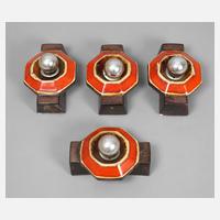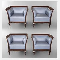 Entwurf um 1920, aus einer Thüringer Villa, für die Albin Müller die gesamte Inneneinrichtung entworfen hat, Gestell aus massivem Nussbaum, tiefe bequeme Clubsessel mit annähernd quadratischer Grundfläche, die Lehnen nach oben hin spitz zulaufend und leicht nach außen gebogen, Altersspuren, Bezüge erneuert, Maße je H 74 x B 80 x T 72 cm.