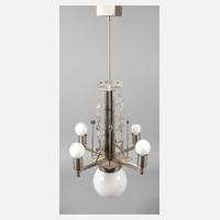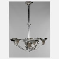 um 1930, verchromtes Metallgestänge mit zentralem trichterförmigen Schirm aus satiniertem Klarglas, daran sechs s-förmig geschwungene kurze Leuchterarme, jeweils eine Lampenfassung in Form einer stilisierten Blüte tragend, ohne Schalen, insgesamt neunflammig, elektrifiziert, Altersspuren, H ca. 95 cm, D ca. 70 cm.