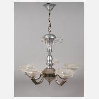 um 1920, versilbertes bzw. vernickeltes Metallgehäuse, Balusterkorpus verziert von drei massiven im Model formgeblasenen Klarglassegmenten in Flügelform, mit fünf c-förmig geschwungenen Leuchterarmen, jeweils eine Lampenfassung sowie eine Schale aus satiniertem und von geometrischen Elementen verziertem Klarglas tragend, leichte Altersspuren, H ca. 85 cm, D ca. 60 cm.