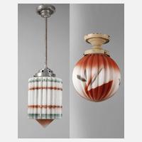 um 1930, Metallgestänge mit abgehängten, im Model formgeblasenen satinierten Milchglasschirmen in Kugel- bzw. Zylinderform, polygonal facettiert und in mehrfarbigem Spritzdekor verziert, Altersspuren, H max. 55 cm.