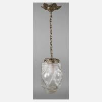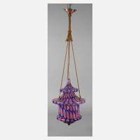 wohl Böhmen, 1930er Jahre, ungemarkt, blaues Glas mit eingeschmolzenen roséfarbenen und weißen rapportierenden Farbschichten, klar überstochen, an drei Kordeln abgehängter Korpus mit abnehmbarem Deckel, Messingmontierungen, einflammig alt elektrifiziert, Mündung etwas best., sonst gute Erhaltung, H ca. 60 cm, D ca. 35 cm.