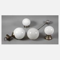 deutsch, um 1930, Schirme aus Milchglas, Fassungen meist vernickelt, Altersspuren, Elektrik rest.bed., Maße H 20, 23, 28 und 67 cm.