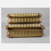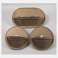 um 1930, Messing brüniert, Leuchtengarnitur, bestehend aus dreiflammigem Zentralelement und zwei je einflammigen kreisrunden Beileuchten, Altersspuren, L max. 50 cm.