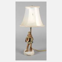 um 1920, ungemarkt, Metallguss mehrfarbig gefasst, runde Basis aus Alabaster mit plastisch gearbeitetem Pierrot beim Lautenspiel, säulenförmig gestalteter Lampenfuß, eine Fassung tragend, einflammig elektrifiziert, Verkabelung rep.bed., Alters- und Gebrauchsspuren, H 40 cm.