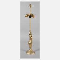 um 1920, Bronze poliert, unsigniert, Entwurf vermutlich Ludwig Vierthaler, polygonal facettierte Basis mit plastischer Darstellung einer stilisierten Frauenfigur, dreiflammig elektrifiziert, H 72 cm.