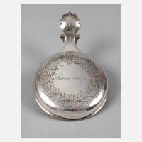 Beschaumeistermarke "LZ 1881" für Ludwig Zug, Silberstempel 84 Zolotniki, Meistermarke "L. Larsen" Riga, innen vergoldet, Besitzermonogramm "T. W. v. W.", außen gravierter Weinlaubdekor und Aufschrift: "suum cuique" (Jedem das Seine), schöner Zustand, L 13,5 cm, G ca. 88 g.