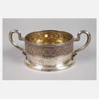 gepunzt Pyetr Baskakov, tätig in Moskau 1883–1908, Silberpunze 84 Zolotniki, Silber getrieben und fein punziert, innen und der Boden vergoldet, geschweifte Uhrenhenkel, umlaufende Ornamentbänder aus verschlungenem Lorbeerlaub und anderen Floralismen, guter altersgemäßer Zustand, D mit Henkeln 21 cm, G ca. 270 g.