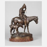 Russland, um 1880, auf der Plinthe signiert, Bronze nuanciert dunkel patiniert und äußerst detailreich nachbearbeitet, Darstellung eines Kosaken zu Pferde mit der typischen Kopfbedeckung Papacha, voll ausgerüstet mit Decken, Satteltasche, Gewehr und Säbel, sich von seiner Frau verabschiedend, auf der rechten Seite ein Kranz, auf naturalistisch gestalteter ovaler Plinthe, auf Holzfuß gesteckt, gute Erhaltung, H Bronze 24 cm, H gesamt 27 cm. Info: Nahezu identisches Motiv auch von Alexei Gratcheff (Gussfabr. C. F. Woerffel, St. Petersburg), Abb. in Bronzes, Sculptors & Founders, Volume II., Harold Berman, Chicago 1994, S: 197, Abb. 1072.