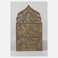 Anfang 20. Jh., kirchenslawisch bezeichnet, Bronze, eingesetzte Partien aus opakem Zellenschmelzemail, vier Darstellungen aus dem Christus- bzw. Marienleben werden bekrönt von Kreuzigungsszene, kleinere Emailverluste, Maße 16,5 x 9 cm.