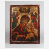 19. Jh., kirchenslawisch bezeichnet, Tempera auf zweifach gesperrter Laubholzplatte, goldbronziert, Kowtscheg, Maria im Typus der Hodegetria mit dem Christusknaben auf ihrem linken Arm, mit der rechten Hand auf ihn verweisend, der Knabe ein Evangelienbuch präsentierend, gerahmt von drei Engeln, Altersspuren, partielle Substanzverluste, Maße 55 x 42 cm.