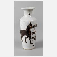 Ende 19. Jh., ungemarkt, Porzellan in hellgrauer Craqueléglasur mit aufgelegten Reliefs in Form eines stolzen Rosses, Altersspuren, H 22 cm.