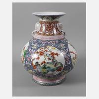 1. Hälfte 20. Jh., am Boden Sechs-Zeichen-Marke, Porzellan in polychromer Emailbemalung, ausladender, gedrungener Korpus mit vier Zierkartuschen, welche verschiedene Vogelmotive in Landschaft zeigen, gerahmt von dichtem Floral- und Ornamentaldekor, figürliche Handhaben in Form von Elefantenhäuptern, ausschwingende Mündung, H 40 cm.