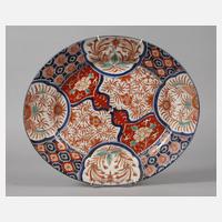 19. Jh., ungemarkt, Porzellan in kobaltblauer Unter- und korallfarbener Aufglasurbemalung sowie Goldstaffage, komplett durchmusterte Platte, brandfleckig, Vergoldung berieben, L 33,5 cm.