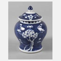 Anfang 20. Jh., ungemarkt, Porzellan in kobaltblauer Unterglasurbemalung, gebauchter Korpus mit aufgesetztem Kuppeldeckel, Wandung verziert von Blütenzweigen, H 15 cm.
