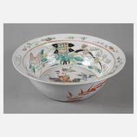 19. Jh., ungemarkt, Porzellan in feiner polychromer Emailbemalung, tief gemuldete Schale mit ausgestelltem flachen Rand, die Wandung innen aufwendig verziert mit floralen Darstellungen und Schmetterlingsmotiven, die Fahne mit figürlicher Darstellung aus der chinesischen Sagenwelt, berieben, am Boden Glasurriss, Altersspuren, D 29 cm.