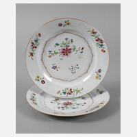 18./19. Jh., ungemarkt, zartes Porzellan in kobaltblauer Unterglasur- und korallroter Aufglasurbemalung mit teils reicher Goldstaffage, Spiegel und Fahne jeweils floral verziert, brandfleckig, partiell berieben bzw. etwas best., D max. 23 cm.