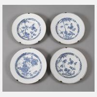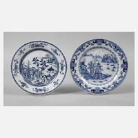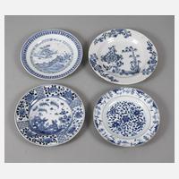 18./19. Jh., ungemarkt, drei aus Porzellan, einer Fayence in kobaltblauer Unterglasurbemalung, in unterschiedlichen Dekoren verziert, mit Landschaftsdarstellung, Floralmotiven und Ornamenten, unterschiedliche Maße und Erhaltungen, D max. 26 cm.