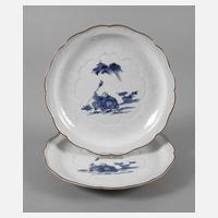 wohl 18. Jh., ungemarkt, Porzellan in kobaltblauer Unterglasurbemalung, die Spiegel verziert von Landschaftsmotiven mit Figurenstaffage, die Fahnen ornamental und floral verziert, brandfleckig, Altersspuren, D je 23 cm.