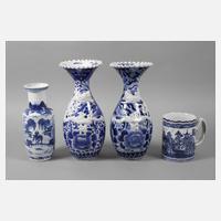 Ende 19. Jh., einmal gemarkt, Porzellan in kobaltblauer Unterglasurbemalung, Paar Keulenvasen mit reliefierten Drachenmotiven und gekniffener ausschwingender Mündung, kleine Vase mit Reiterdarstellungen in Landschaft sowie Krug mit Vedutenmalerei, teils bestoßen, brandfleckig, Altersspuren, H max. 31,5 cm.