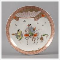 um 1900, am Boden gepinselte Marke, Porzellan in polychromer Aufglasurbemalung und Goldstaffage, zentrale figürliche Darstellung mit Szene aus der Fabelwelt, gerahmt von zartem Ornamentband, brandfleckig, reinig.bed., D 39 cm.