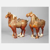 im Tang Stil, 20. Jh., ungemarkt, cremefarbener Scherben in ausgewogener Sancai-Glasur, überaus dekorative Darstellung zweier gesattelter Pferde mit aufgelegten, durchbrochen gearbeiteten, ornamentalen Verzierungen aus vergoldetem Messing, eingesetzte Cabochons aus Buntglas, min. Altersspuren, Maße je ca. 58 x 58 cm.